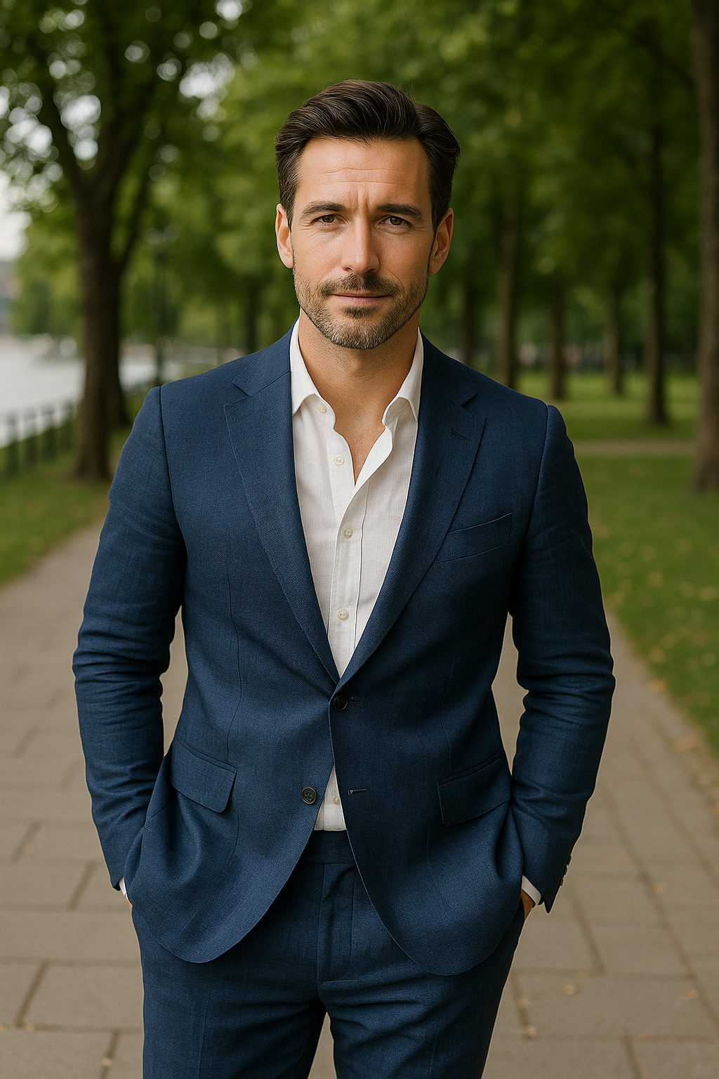 Medium dark blue 100% linen suit from Longford Cloth Company, London.