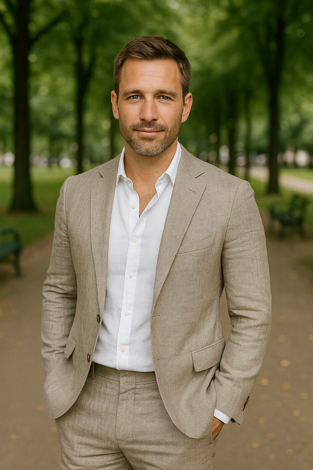 Medium beige 100% linen suit from Longford Cloth Company, London.