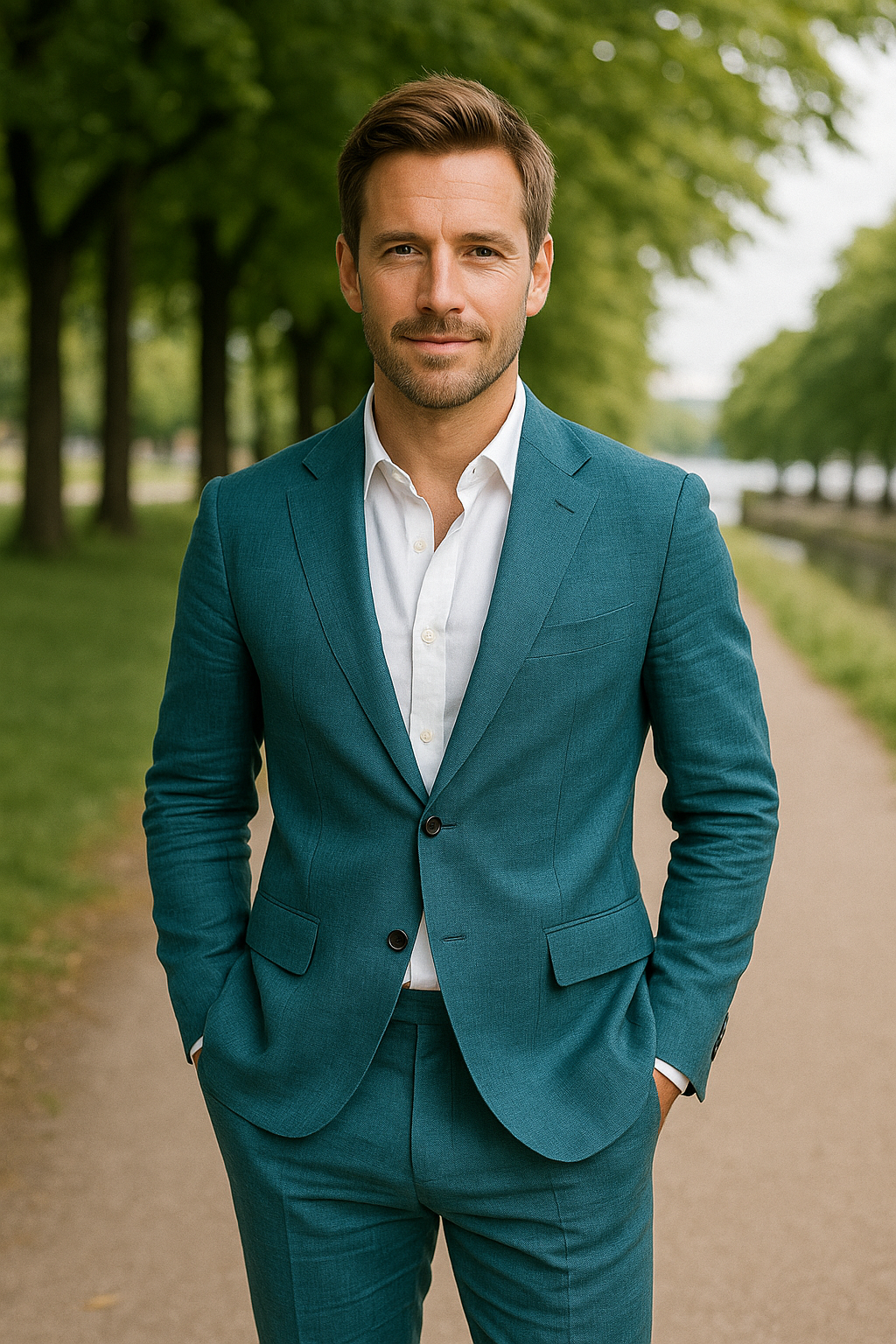 Petrol blue 100% linen suit from Longford Cloth Company, London.